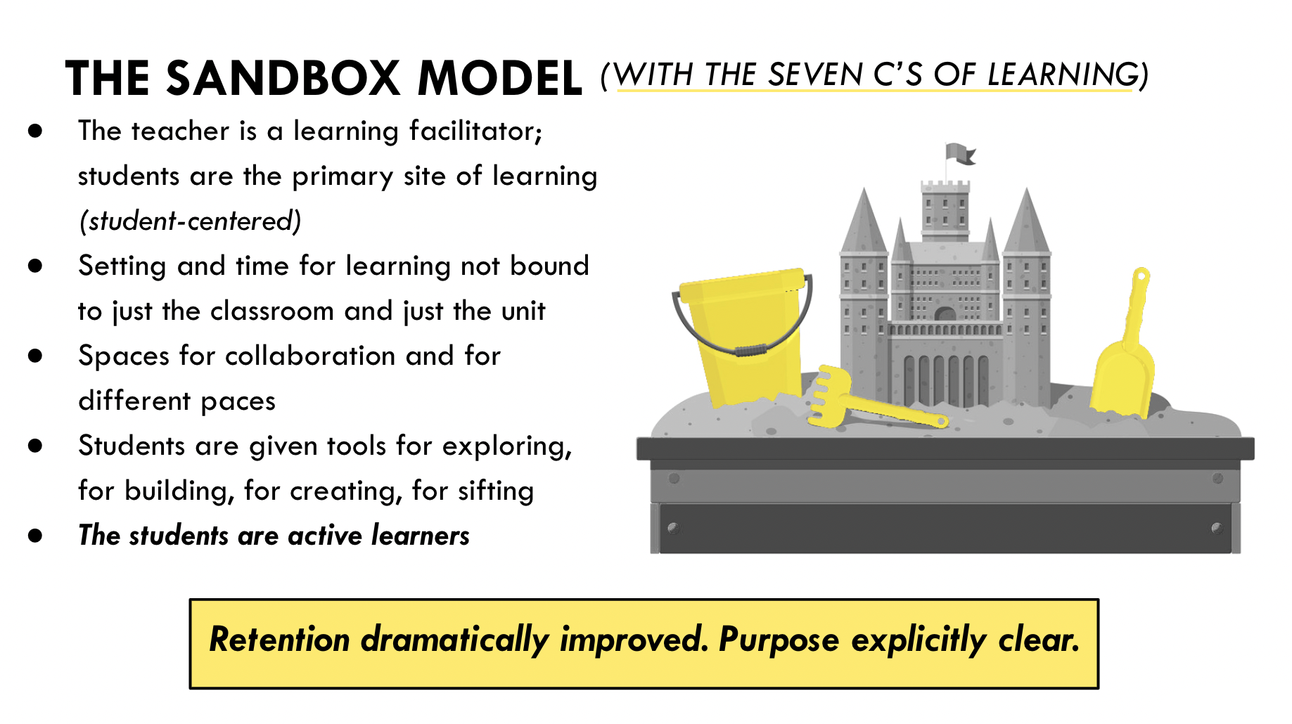 Next is The Sandbox Model which aligns with The Seven C’s of Learning and various other student centered pedagogies like problem-based learning, constructivism, service learning, etc.